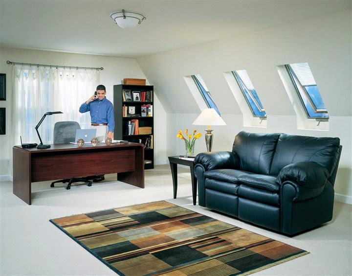 If your home office happens to be located in a renovated attic space, roof windows, which are very much like skylights but are in-reach, can offer natural light and fresh air plus access to the roof for debris removal, maintenance or for emergency egress.